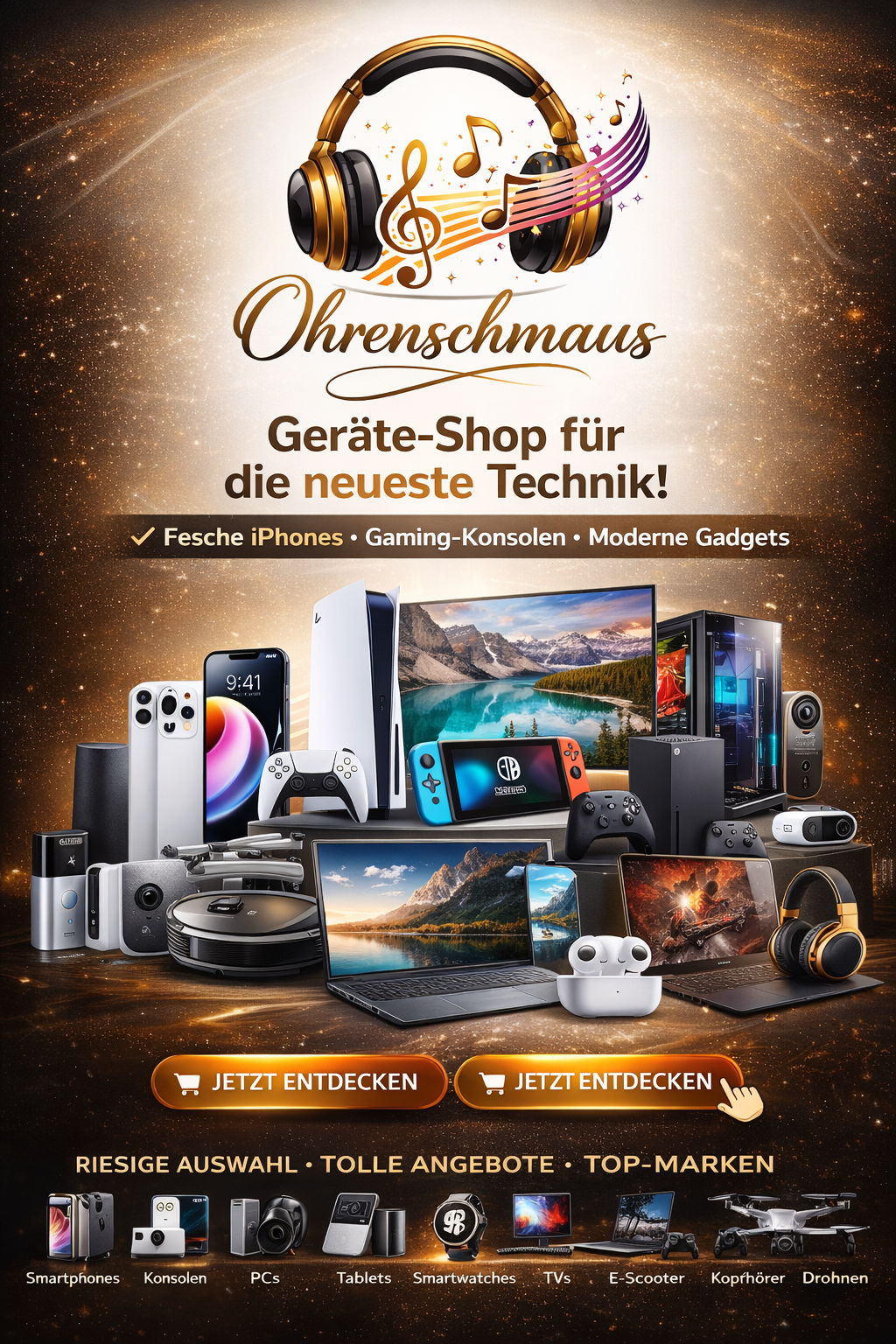 Ohrenschmaus Shop ist ein Online‑Shop, der sich auf den Verkauf von Hightech -, Elektronik-und Haushaltsgeräten spezialisiert hat.