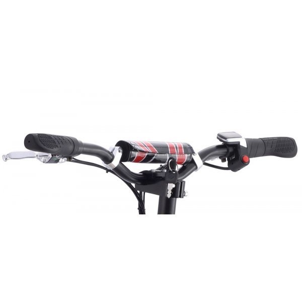 Der rote Knopf am Lenker schaltet zwischen hohem und niedrigem Gang um. Der Lenker hat auch das Zündschloss, die Handbremse (vorne und hinten) und den Gashebel.